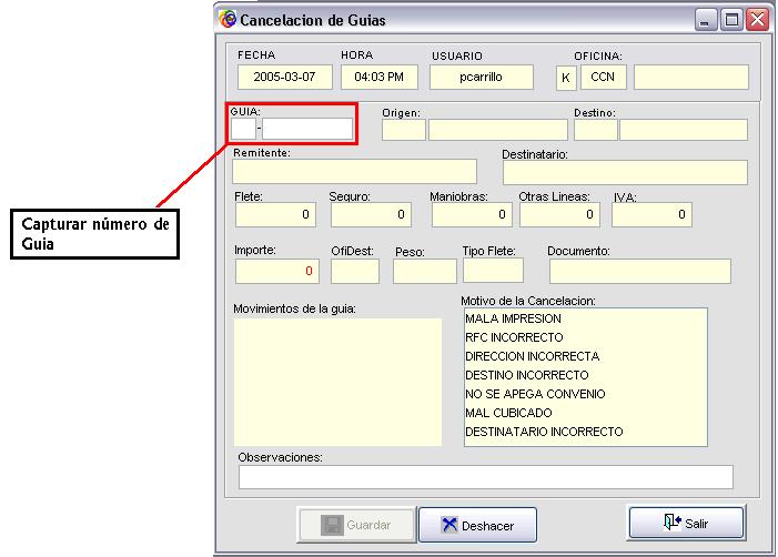 Una vez hecho esto, aparecerá la pantalla que se muestra en la imágen, en ésta aparece el usuario que esta accesando la fecha actual y la oficina a la que pertenece, para realizar la cancelación es necesario capturar el número de la guìa a cancelar. |
