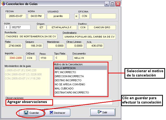 Despues de especificar el número de Guía el sistema desplegará la información con la que se cuenta sobre la misma, es de utilidad que verifique los datos que se muestran y se asegure de que éstos son los datos de la Guía a cancelar, una vez hecho esto se determina el motivo de la cancelación y, si se desea,se capturan observaciones. Para efectuar la cancelación dar clic en Guardar |