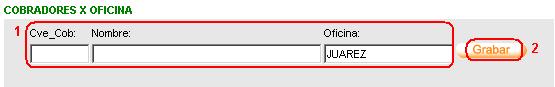 I. Esta pantalla consta de dos áreas, el área de captura. en el área de captura procedemos a indicar la clave que le asignaremos al cobrador(1) una vez realizado esto oprimiremos el botón de grabar(2).