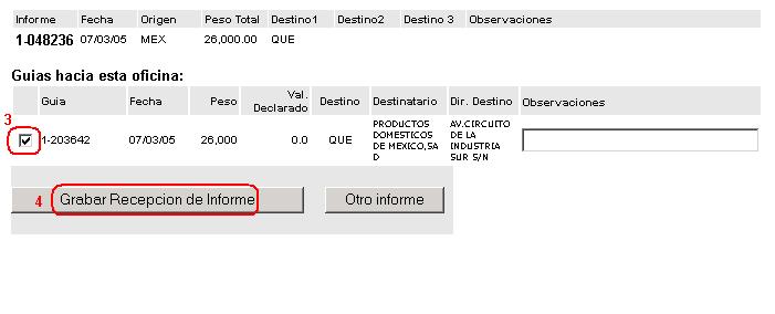 - Una vez capturado el Informe y haber dado clic en ejecutar aparecerá la lista de Guías que contiene, procedemos a indicar cuales guías vamos a recibir.