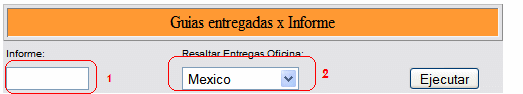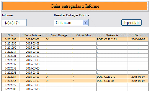 Mostrar cuales guias correspondientes al informe indicado tienen movimiento de entregadas, resaltando aquellas guias que tienen movimiento en la oficina que se seleccione de la lista .