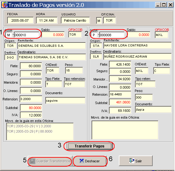 Una vez hecho esto los pagos serán transferido, (5)deberás pulsar el botón Guardar Transferencia. Así quedarán registrados los datos.
